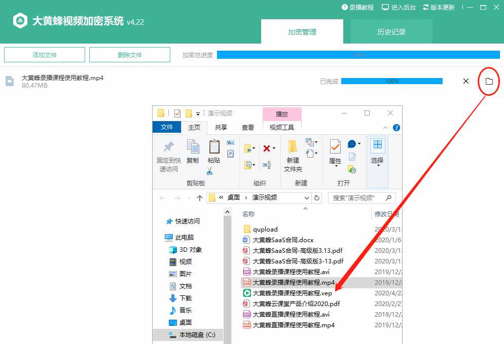 等待加密进度条加载到100%后,提示加密完成,可查看加密好的手机视频文件。
