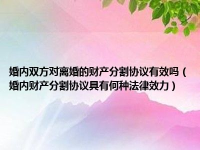 目前大家应该是对婚内财产分割协议具有何种法律效力比较感兴趣的,所以今天CC就来为大家整理了一些关于婚内财产分割协议具有何种法律效力方面的相关知识来分享给大家,希望大家会喜欢哦。