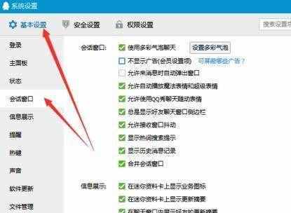 打开QQ,点击系统设置图标,点击基本设置下面的会话窗口,如下图所示。我们就可以看到整个会话窗口的设置界面了。