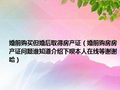 导读 目前大家应该是对婚前购房房产证问题谁知道介绍下呗本人在线等谢谢哈!比较感兴趣的,所以今天好房网小编CC就来为大家整理了一些关于婚前购