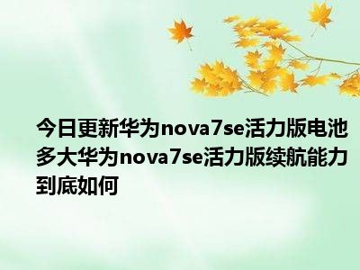 目前上述的内容应该能够为大家解答出大家对于华为nova7se活力版电池多大华为nova7se活力版续航能力到底如何的疑惑了,所以如果大家还想要了解更多的知识内容,也可以关注本站其他文章进行了解哦。