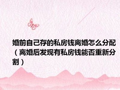目前大家应该是对离婚后发现有私房钱能否重新分割比较感兴趣的,所以今天CC就来为大家整理了一些关于离婚后发现有私房钱能否重新分割方面的相关知识来分享给大家,希望大家会喜欢哦。