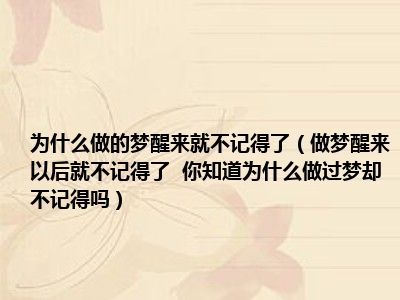 目前大家应该是对做梦醒来以后就不记得了 你知道为什么做过梦却不记得吗比较感兴趣的,所以今天小编CC就来为大家整理了一些关于做梦醒来以后就不记得了 你知道为什么做过梦却不记得吗方面的相关知识来分享给大家,希望大家会喜欢哦。