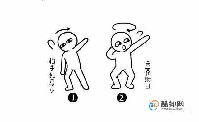 抬手扎马步,一只手放在脑后,一只手平举在前面从左至右晃动,双脚一直晃动。
