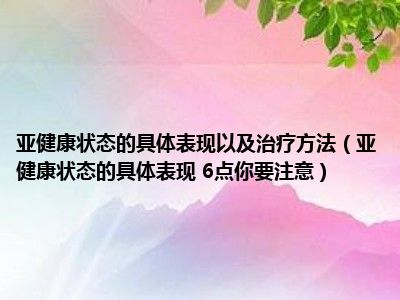目前大家应该是对亚健康状态的具体表现 6点你要注意比较感兴趣的,所以今天小编CC就来为大家整理了一些关于亚健康状态的具体表现 6点你要注意方面的相关知识来分享给大家,希望大家会喜欢哦。