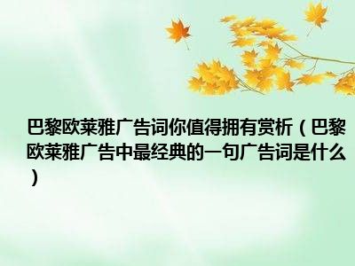 目前应该是有很多小伙伴对于巴黎欧莱雅广告中最经典的一句广告词是什么方面的信息比较感兴趣,现在小编就收集了一些与巴黎欧莱雅广告中最