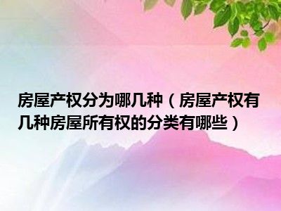 国有房产:具体又分三个细类:直管产、自管产、军产。直管产又分中央级公产、市级公产、区(县)级公产和拨用产。集体所有房产:指城市集体所有制单位投资建造、购买的房产。私有房产:包括中国公民、港澳台同胞、海外侨胞、在华外国侨民、外国人投资建造或购买的房产以及中国公民投资的私营企业投资建造、购买的房产。联营企业房产:指不同所有制性质的单位之间共同组成新的法人型经济实体所投资建造、购买的房产。股份制企业房产:股份制企业投资建造、购买的房产。港、澳、台胞房产:具体又分为合资产、合作产和独资产。涉外房产:指中外合资经营企业、中外合作企业和外资企业、外国政府、社会团体、国际性机构投资建造合伙购买的房产,又分为中外合资、中外合作、外企产和外产。其他产:凡不属于以上各类别的房产,都归在这一类。具体有四种:其他产、代管产、宗教产和社团产。