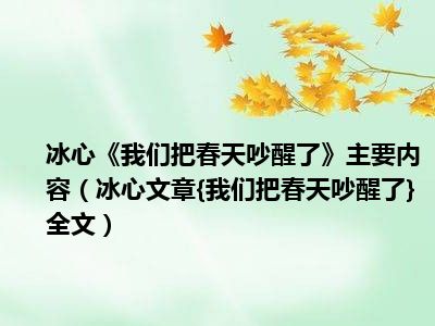 目前应该是有很多小伙伴对于冰心文章{我们把春天吵醒了}全文方面的信息比较感兴趣,现在小编就收集了一些与冰心文章{我们把春天吵醒了}全文相关的信息来分享给大家,感兴趣的小伙伴可以接着往下看,希望会帮助到你哦。