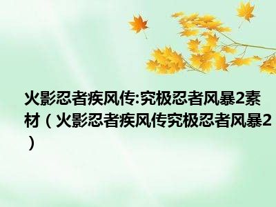1、《火影忍者疾风传:究极忍者风暴2》是万代南梦宫开发的一款以火影忍者为原型开发的动作格斗类游戏,剧情讲述的是鸣人随自来也外出修行两年半以后,回到木叶。
