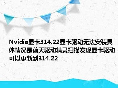 相信目前很多小伙伴对于英伟达显卡314.22图形驱动程序安装不上,具体状况是前天用驱动精灵扫描发现显卡驱动可更新为314.22,都比较感兴趣,那么小编今天在网上也是收集了一些与英伟达显卡314.22图形驱动程序安装不上,具体状况是前天用驱动精灵扫描发现显卡驱动可更新为314.22,相关的信息来分享给大家,希望能够帮助到大家哦。