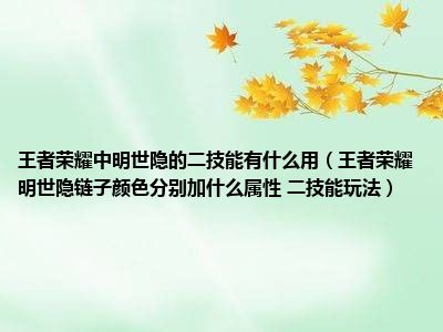 目前应该是有很多小伙伴对于王者荣耀明世隐链子颜色分别加什么属性 二技能玩法方面的信息比较感兴趣,现在小编就收集了一些与王者荣耀明世隐链子颜色分别加什么属性 二技能玩法相关的信息来分享给大家,感兴趣的小伙伴可以接着往下看,希望会帮助到你哦。