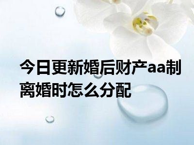 婚后财产aa制离婚时分配应当按照之前约定的来进行,没有约定的话,视为夫妻共同财产,离婚时,夫妻的共同财产由双方协议处理;协议不成时,由人民法院根据财产的具体情况,照顾子女和女方权益的原则判决。