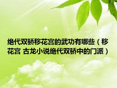 导读 目前是有很多朋友们对于移花宫 古龙小说绝代双骄中的门派这个信息比较感兴趣,那么小编也是收集了一些移花宫 古龙小说绝代双骄中的门派相...