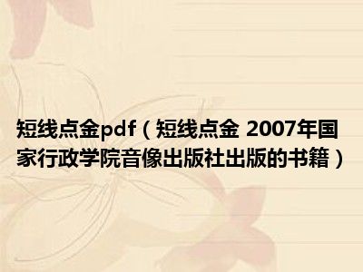 导读 目前是有很多朋友们对于短线点金 2007年国家行政学院音像出版社出版的书籍这个信息比较感兴趣,那么小编也是收集了一些短线点金 2007年国...