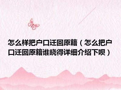 各地户口回迁的具体要求不一样,以当地要求为准,下面介绍重庆地区的做法,供参考: 据重庆市公安局、人事局、市教委、市劳动和社会保障局联合发文《关于我市普通高等院校和中等职业**及技工**学生户口迁移有关问题的通知》(渝公发[2003]164号)文件第二条:新生入学、毕业生户口迁移办法第六项规定:毕业生未落实工作单位申请户口迁往原籍父母或现父母家庭所在地的,分别凭市教委签发的《重庆市普通大中专毕业生入户通知单》和主城区以外区、县公安局、人事局、教委统一签发的《入户证明》及《户口迁移证》办理迁入手续。一般户口迁移流程:第一步:向迁入地派出所提出申请 第二步:迁入地派出所同意迁入 第三步;向现户口所在地派出所提出迁出申请 第四步:户口所在地派出所开户籍证明 第五步:持户籍证明和相关证明材料(你的理由)前往迁入地的市级公安局户政科申请迁入 第六步:户政科签发《准迁证》 第七步:持《准迁证》回户口所在地派出所办理迁出并开迁移证 第八步;持迁移证、身份证去迁入地派出所入户