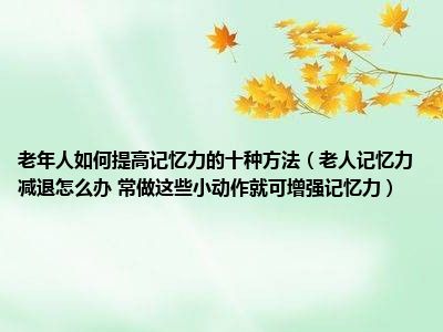 目前大家应该是对老人记忆力减退怎么办 常做这些小动作就可增强记忆力比较感兴趣的,所以今天小编CC就来为大家整理了一些关于老人记忆力减退怎么办 常做这些小动作就可增强记忆力方面的相关知识来分享给大家,希望大家会喜欢哦。