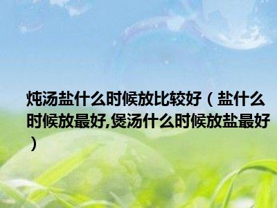 目前大家应该是对盐什么时候放最好,煲汤什么时候放盐最好比较感兴趣的,所以今天小编CC就来为大家整理了一些关于盐什么时候放最好,煲汤什么时候放盐最好方面的相关知识来分享给大家,希望大家会喜欢哦。