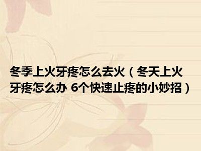目前大家应该是对冬天上火牙疼怎么办 6个快速止疼的小妙招比较感兴趣的,所以今天小编CC就来为大家整理了一些关于冬天上火牙疼怎么办 6个快速止疼的小妙招方面的相关知识来分享给大家,希望大家会喜欢哦。