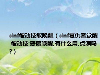 相信目前很多小伙伴对于dnf复仇者觉醒 被动技:恶魔唤醒,有什么用,点满吗?都比较感兴趣,那么小编今天在网上也是收集了一些与dnf复仇者觉醒 被动技:恶魔唤醒,有什么用,点满吗?相关的信息来分享给大家,希望能够帮助到大家哦。