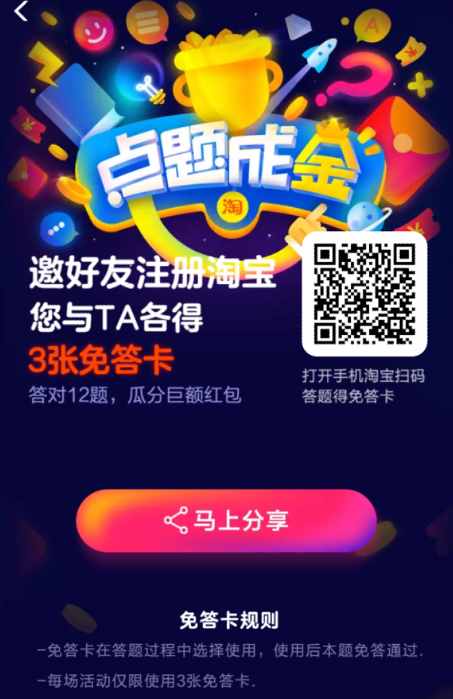 免答卡:邀请好友注册淘宝,您与ta各得3张免答卡,免答卡在答题过程中选择使用,使用后本题免答通过,每场活动仅限使用3张免答卡。