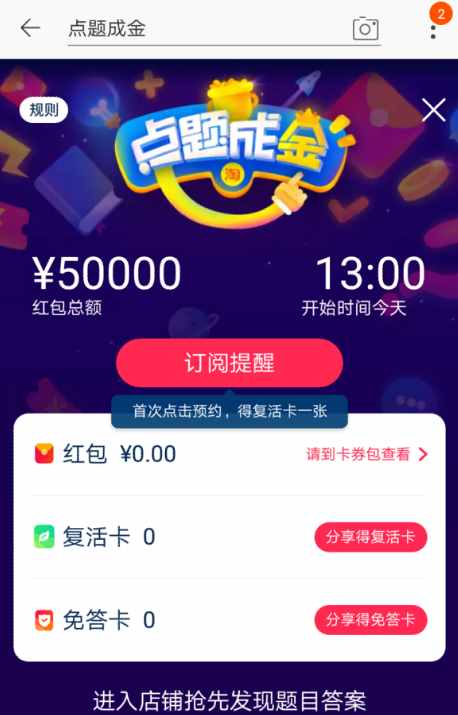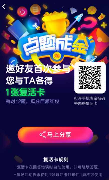 复活卡:邀请好友首次参与,您于ta各得一张复活卡,复活卡在回答错误时自动使用,并可继续答题,每场活动仅限使用一张复活卡,最后一题不可使用;